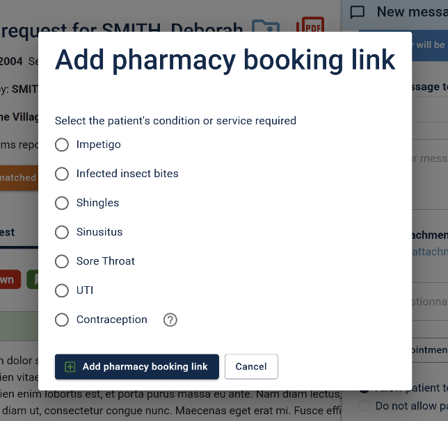 As before, should your patients submit a medical consultation, or admin query, you can refer them to the service by adding a pharmacy booking link when messaging the patient.
